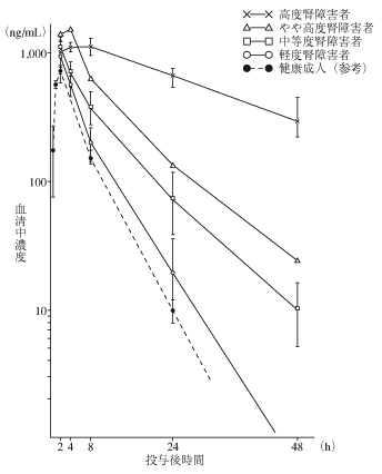 腎機能障害患者にチアプリド錠100mgを経口投与した場合注2)、Ccrの低下に伴って消失半減期は遅延し、中等度以上の腎機能障害患者(Ccr 60mL/min以下)では健康成人に比べて半減期は2倍以上になった3)。