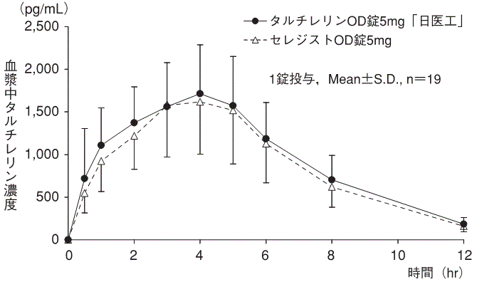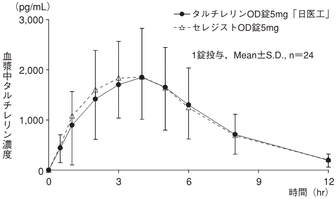 タルチレリンOD錠5mg「日医工」及びセレジストOD錠5mgを、クロスオーバー法によりそれぞれ1錠(タルチレリン水和物として5mg)健康成人男子に絶食単回経口投与(水なしで服用及び水で服用)して血漿中タルチレリン濃度を測定し、得られた薬物動態パラメータ(AUC、Cmax)について90%信頼区間法にて統計解析を行った結果、log(0.80)~log(1.25)の範囲内であり、両剤の生物学的同等性が確認された3)。