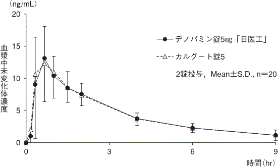 デノパミン錠5mg「日医工」及びカルグート錠5を、クロスオーバー法によりそれぞれ2錠(デノパミンとして10mg)健康成人男子に絶食単回経口投与して血漿中未変化体濃度を測定し、得られた薬物動態パラメータ(AUC、Cmax)について90%信頼区間法にて統計解析を行った結果、log(0.8)~log(1.25)の範囲内であり、両剤の生物学的同等性が確認された2)。