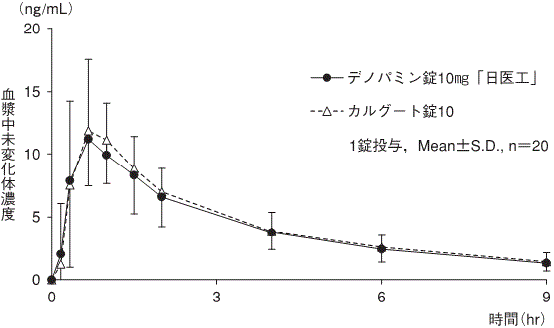 デノパミン錠10mg「日医工」及びカルグート錠10を、クロスオーバー法によりそれぞれ1錠(デノパミンとして10mg)健康成人男子に絶食単回経口投与して血漿中未変化体濃度を測定し、得られた薬物動態パラメータ(AUC、Cmax)について90%信頼区間法にて統計解析を行った結果、log(0.8)~log(1.25)の範囲内であり、両剤の生物学的同等性が確認された3)。