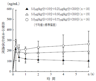 健康成人男性に体重1kgあたりミルリノンとして50μgを10分かけて緩徐に静脈内投与し、引き続き1分間あたり0.5μg/kgを110分間点滴静脈内投与したとき、血漿中未変化体濃度は投与開始後30分以降投与終了まで約100ng/mLの濃度を維持した。投与終了後の消失は速やかであり、消失相の半減期は約50分であった1)。