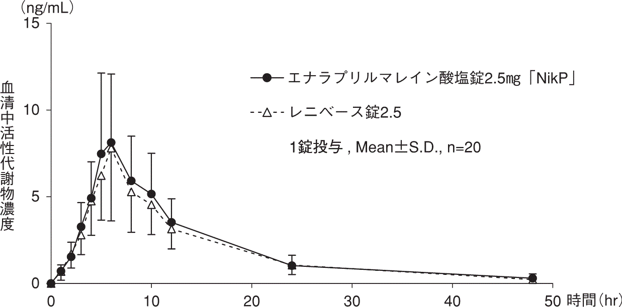 エナラプリルマレイン酸塩錠2.5mg「NikP」及びレニベース錠2.5を、クロスオーバー法によりそれぞれ1錠(エナラプリルマレイン酸塩として2.5mg)健康成人男子に絶食単回経口投与して活性代謝物であるジアシド体の血清中濃度を測定し、得られた薬物動態パラメータ(AUC、Cmax)について90%信頼区間法にて統計解析を行った結果、両剤の生物学的同等性が確認された5)。
