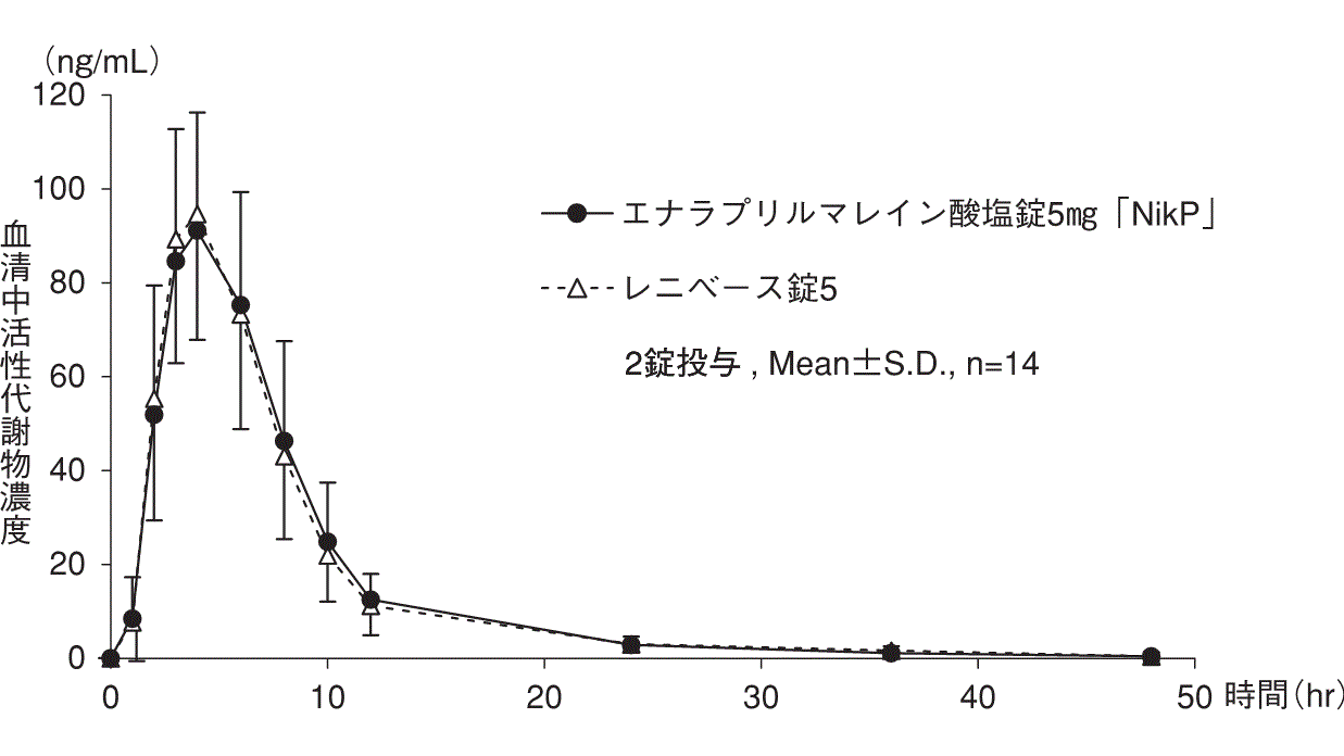 エナラプリルマレイン酸塩錠5mg「NikP」及びレニベース錠5を、クロスオーバー法によりそれぞれ2錠(エナラプリルマレイン酸塩として10mg)健康成人男子に絶食単回経口投与して活性代謝物であるジアシド体の血清中濃度を測定し、得られた薬物動態パラメータ(AUC、Cmax)について分散分析法にて統計解析を行った結果、両剤の生物学的同等性が確認された6)。