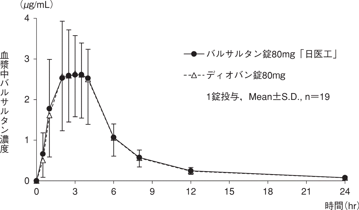 バルサルタン錠160mg「日医工」及びディオバン錠160mgを、クロスオーバー法によりそれぞれ1錠(バルサルタンとして160mg)健康成人男性に絶食単回経口投与して血漿中バルサルタン濃度を測定し、得られた薬物動態パラメータ(AUC、Cmax)について90%信頼区間法にて統計解析を行った結果、log(0.80)~log(1.25)の範囲内であり、両剤の生物学的同等性が確認された9)。