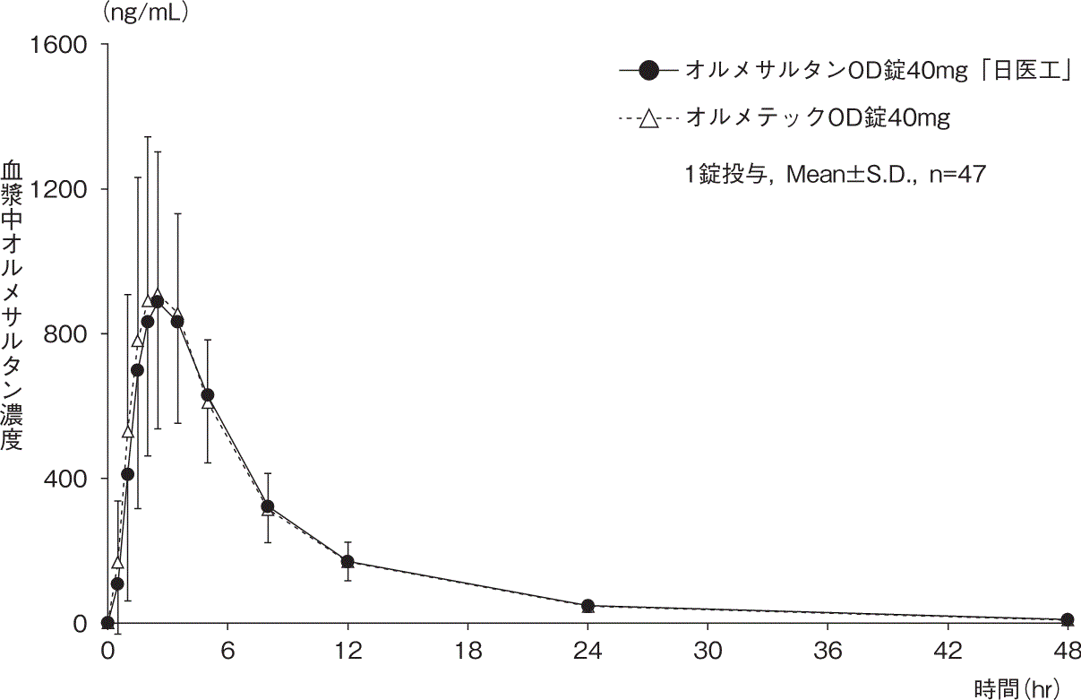 オルメサルタンOD錠40mg「日医工」及びオルメテックOD錠40mgを、クロスオーバー法によりそれぞれ1錠(オルメサルタン メドキソミルとして40mg)健康成人男性に絶食単回経口投与(水なしで服用及び水で服用)して血漿中オルメサルタン濃度を測定し、得られた薬物動態パラメータ(AUC、Cmax)について90%信頼区間法にて統計解析を行った結果、log(0.80)~log(1.25)の範囲内であり、両剤の生物学的同等性が確認された7)。