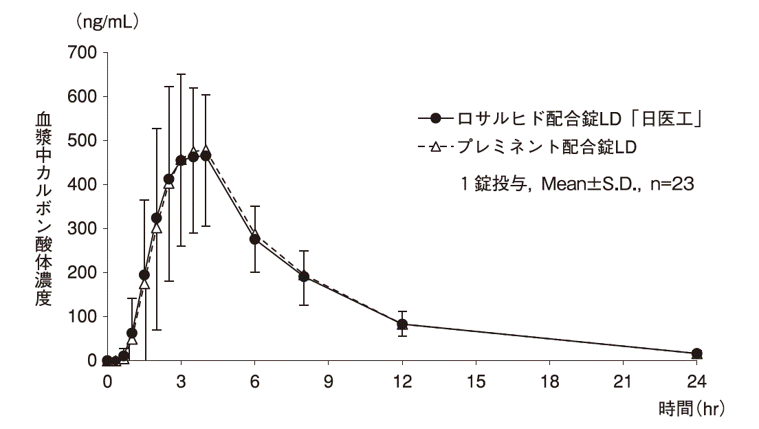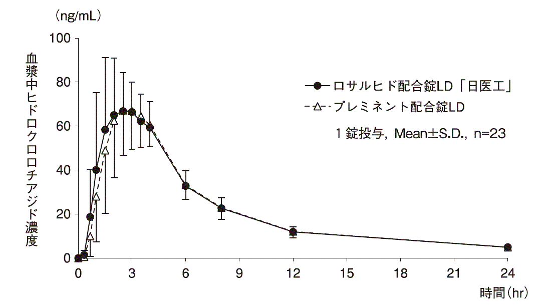 ロサルヒド配合錠HD「日医工」は、ロサルヒド配合錠LD「日医工」を標準製剤としたとき、溶出挙動が同等と判定され、生物学的に同等とみなされた19)。