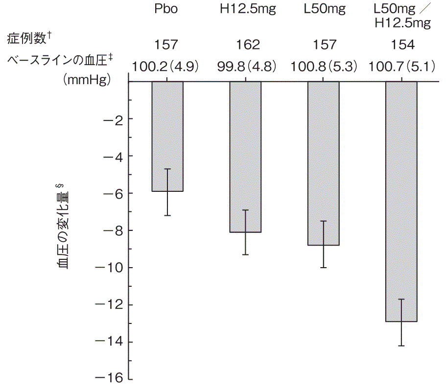 ロサルタンカリウム/ヒドロクロロチアジド50mg/12.5mgを8週間服用後に血圧コントロールが不十分であった日本人本態性高血圧症患者を対象に長期安全性を評価した第Ⅲ相試験の二重盲検期(8週間)において、ロサルタンカリウム/ヒドロクロロチアジド100mg/12.5mgはロサルタンカリウム/ヒドロクロロチアジド50mg/12.5mgと比べて、投与8週時の平均トラフ坐位拡張期血圧では同程度の降圧効果を示し、投与8週時の平均トラフ坐位収縮期血圧では上乗せの降圧効果を示した。投与8週時における平均トラフ坐位血圧のベースラインからの変化量を表2に示す23),25)。