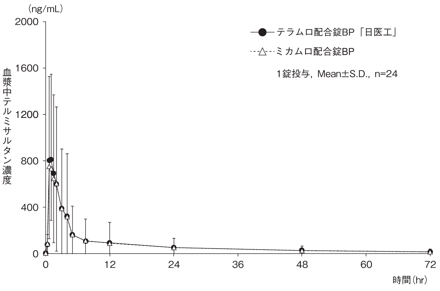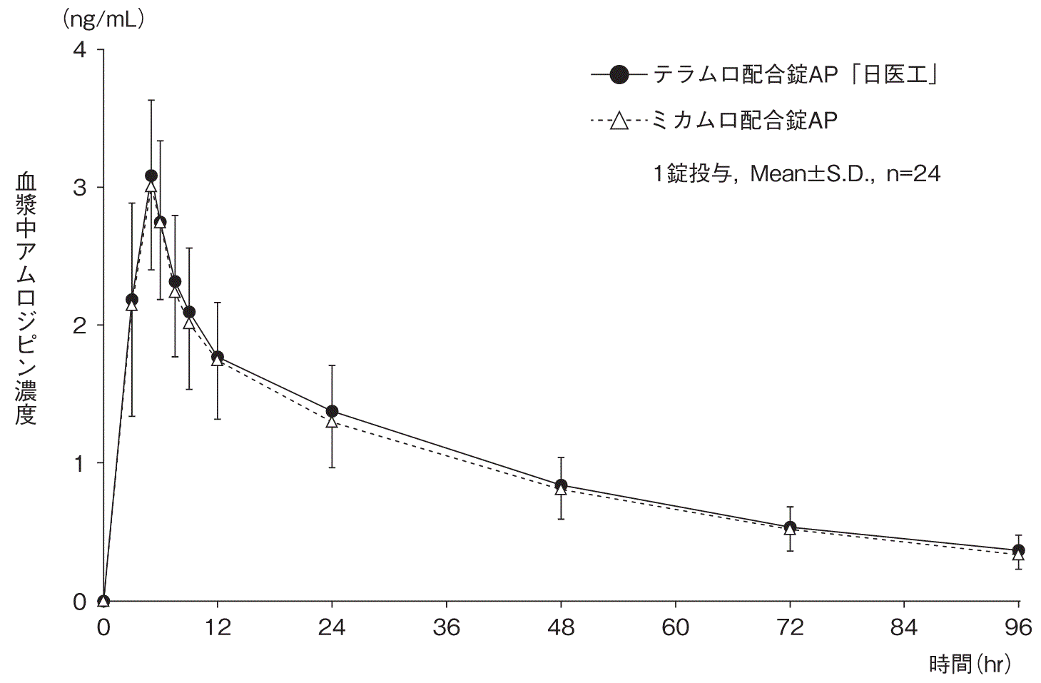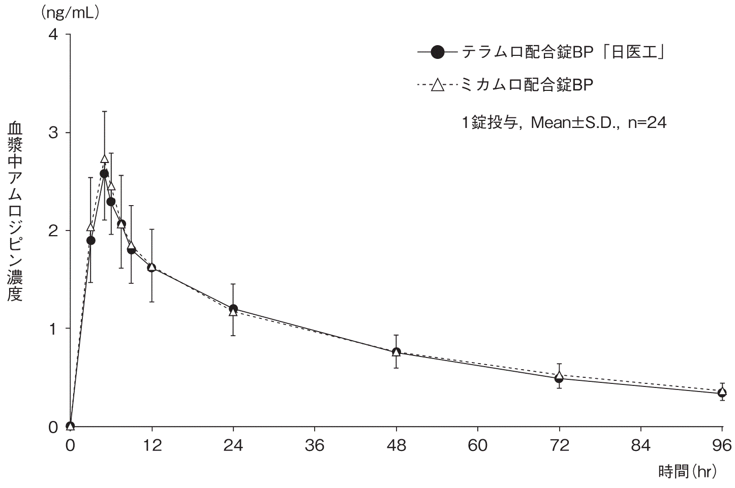 テルミサルタンあるいはアムロジピン単独あるいは併用による作用について、以下の報告がある。覚醒下の雄性高血圧自然発症ラット(SHR)を用いて、1mg/kgテルミサルタン及び5mg/kgアムロジピンを1日1回経口投与し、5日間経時的に血圧を測定したところ、1mg/kgテルミサルタン及び5mg/kgアムロジピンは、それぞれ単独投与により平均血圧が約25mmHg低下し、ほぼ同様の血圧低下作用を示した。次に、1mg/kgテルミサルタン、5mg/kgアムロジピン併用で1日1回5日間経口投与を行い、経時的に血圧を測定した。テルミサルタンとアムロジピンの併用投与による血圧に対する作用は、単独投与による血圧低下作用(約25mmHgの低下)に比べ、有意な血圧低下作用(約50mmHgの低下)がみられた34)。