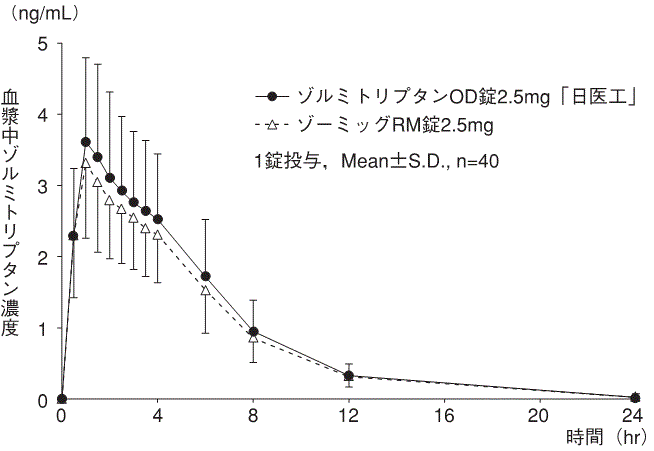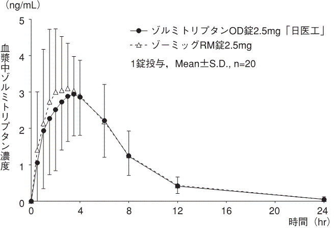 ゾルミトリプタンOD錠2.5mg「日医工」及びゾーミッグRM錠2.5mgを、クロスオーバー法によりそれぞれ1錠(ゾルミトリプタンとして2.5mg)健康成人男性に絶食単回経口投与して血漿中ゾルミトリプタン濃度を測定し、得られた薬物動態パラメータ(AUC、Cmax)について90%信頼区間法にて統計解析を行った結果、log(0.80)~ log(1.25)の範囲内であり、両剤の生物学的同等性が確認された8)。