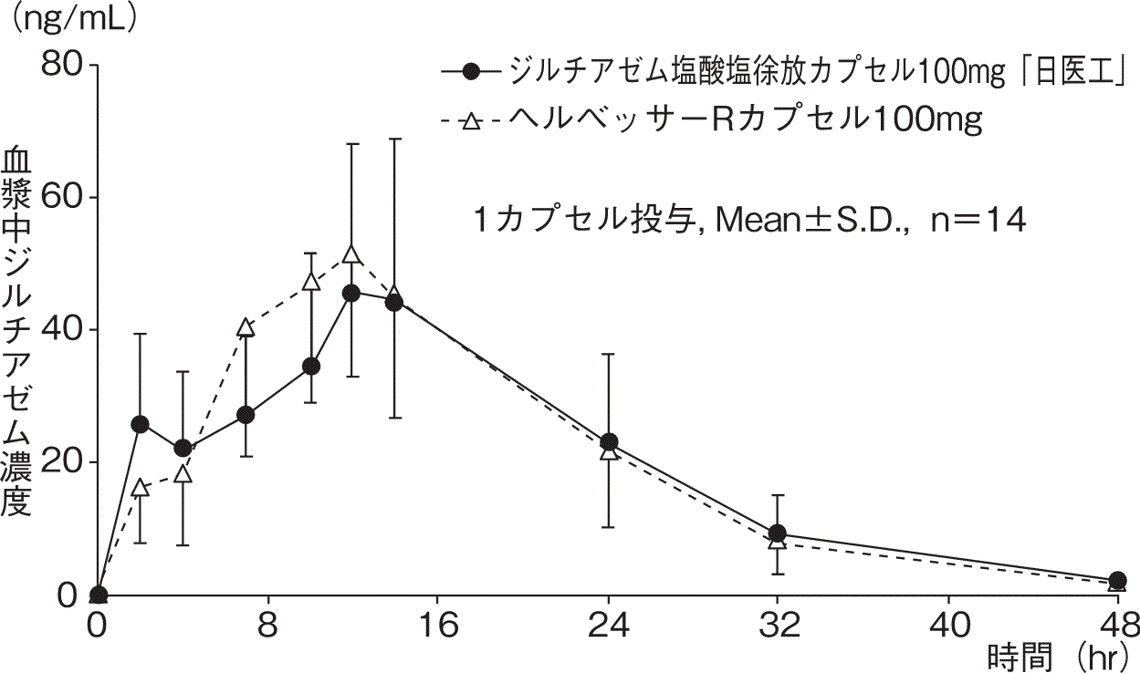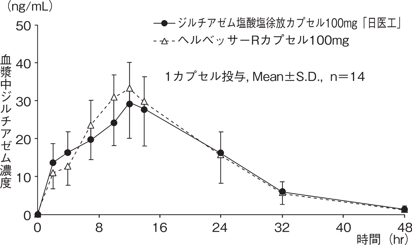 ジルチアゼム塩酸塩徐放カプセル100mg「日医工」及びヘルベッサーRカプセル100mgを、クロスオーバー法によりそれぞれ1カプセル(ジルチアゼム塩酸塩として100mg)健康成人男子に絶食単回経口投与して血漿中ジルチアゼム濃度を測定し、得られた薬物動態パラメータ(AUC、Cmax)について統計解析を行った結果、両剤の生物学的同等性が確認された2)。