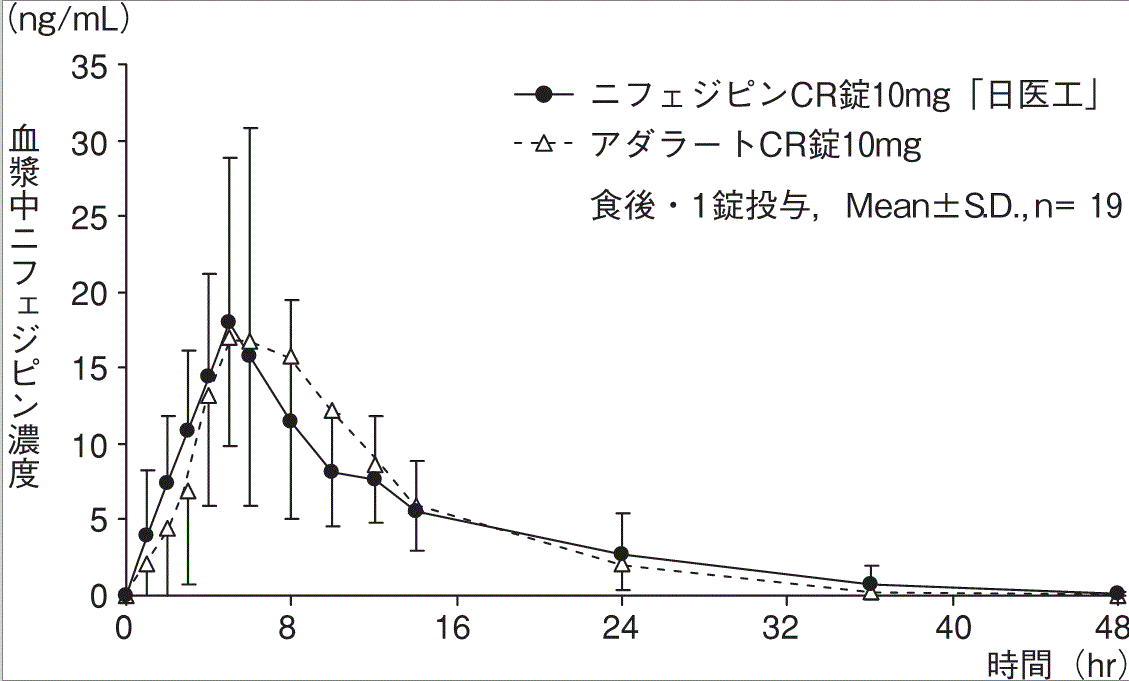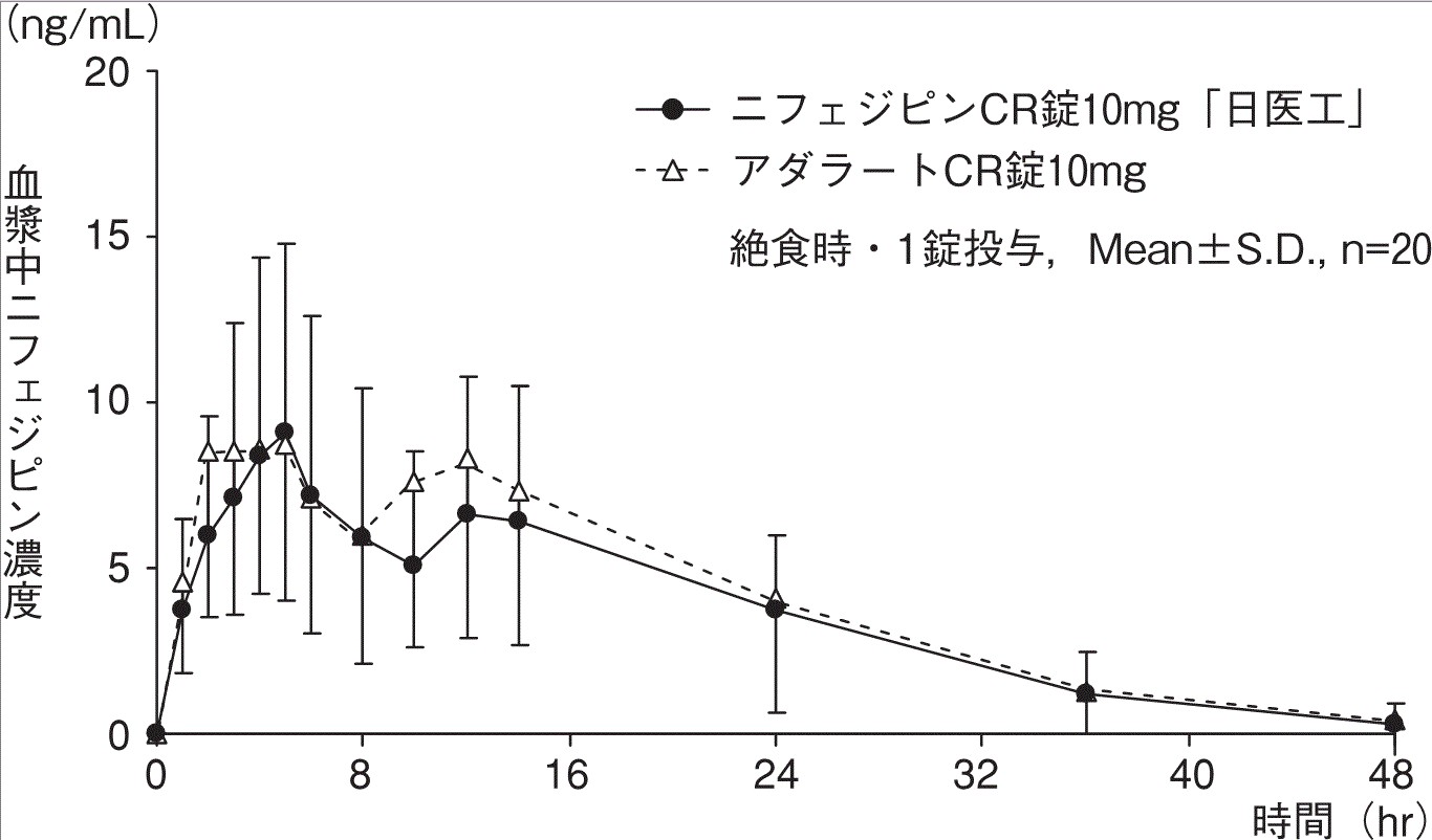 ニフェジピンCR錠10mg「日医工」及びアダラートCR錠10mgを、クロスオーバー法によりそれぞれ1錠(ニフェジピンとして10mg)健康成人男子に絶食及び食後単回経口投与して血漿中ニフェジピン濃度を測定し、得られた薬物動態パラメータ(AUC、Cmax)について90%信頼区間法にて統計解析を行った結果、log(0.80)~log(1.25)の範囲内であり、両剤の生物学的同等性が確認された3)。