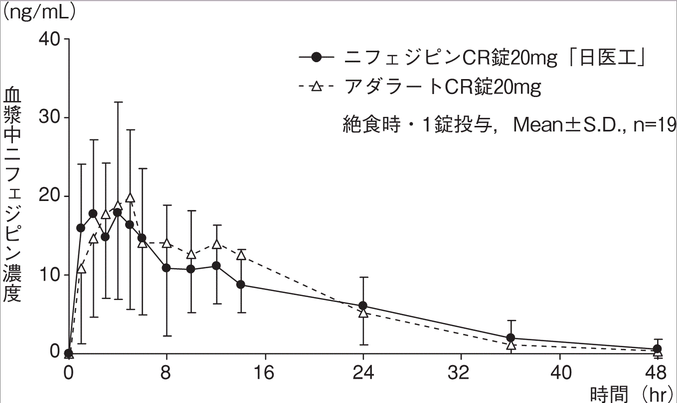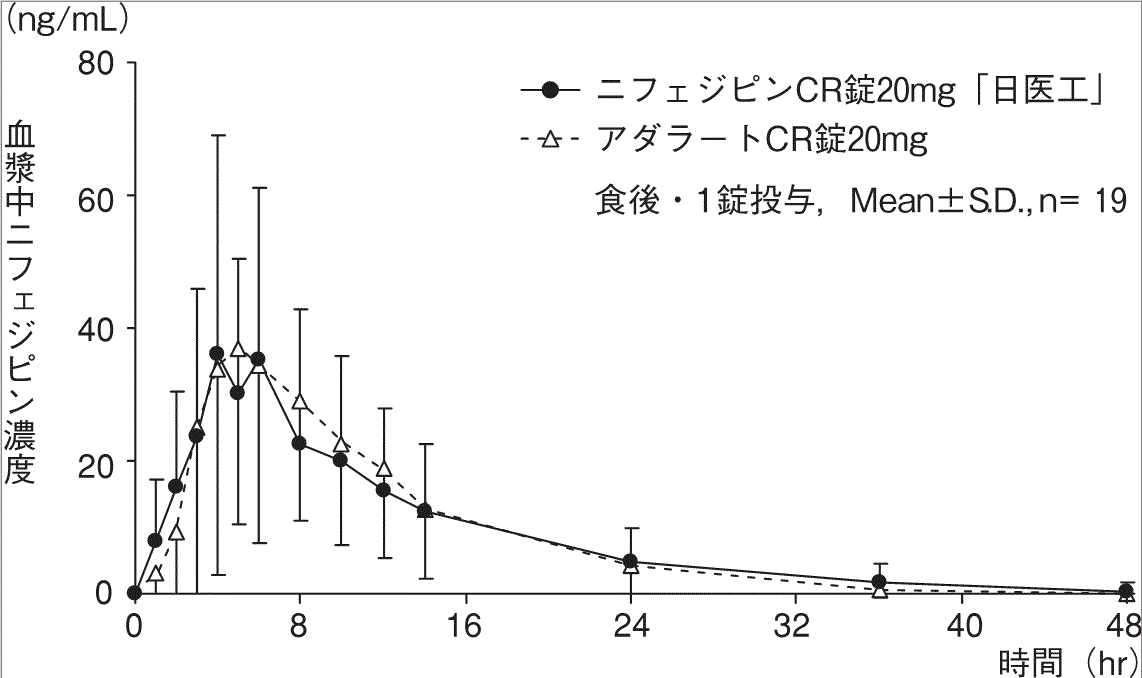 ニフェジピンCR錠20mg「日医工」及びアダラートCR錠20mgを、クロスオーバー法によりそれぞれ1錠(ニフェジピンとして20mg)健康成人男子に絶食及び食後単回経口投与して血漿中ニフェジピン濃度を測定し、得られた薬物動態パラメータ(AUC、Cmax)について90%信頼区間法にて統計解析を行った結果、log(0.80)~log(1.25)の範囲内であり、両剤の生物学的同等性が確認された4)。