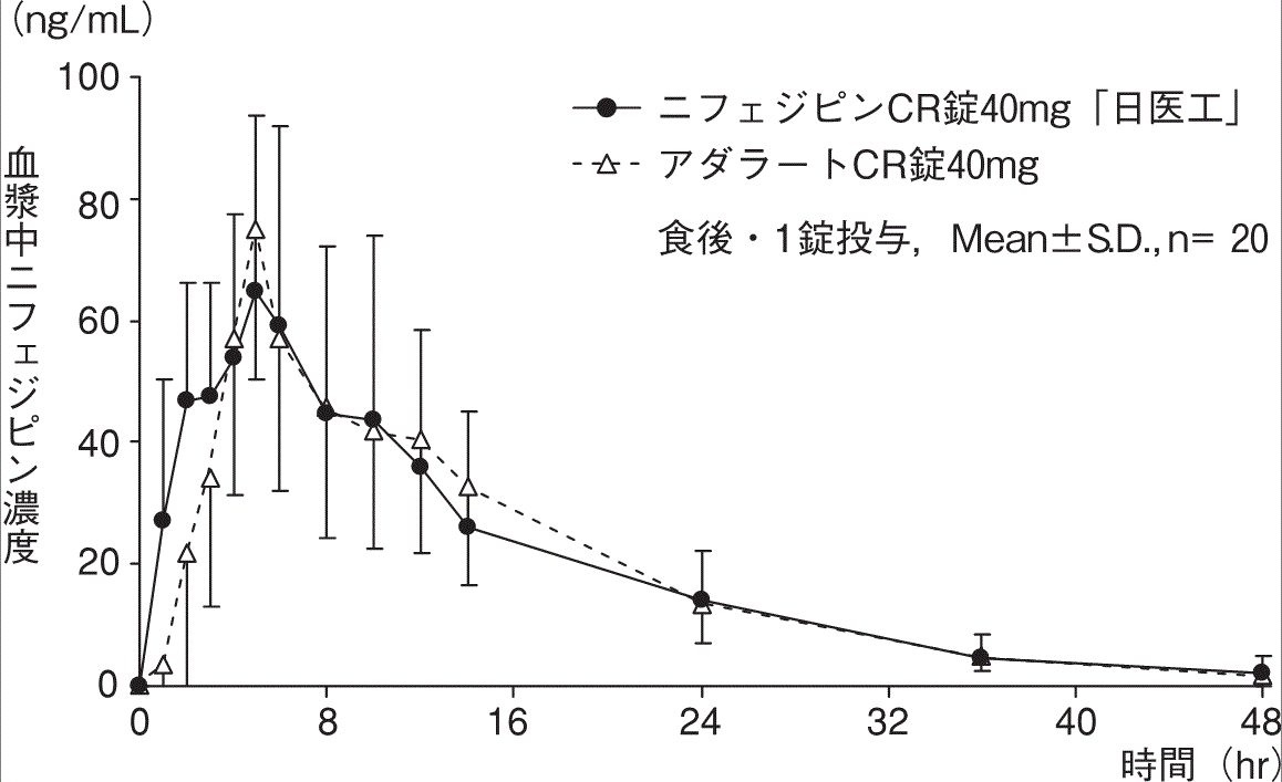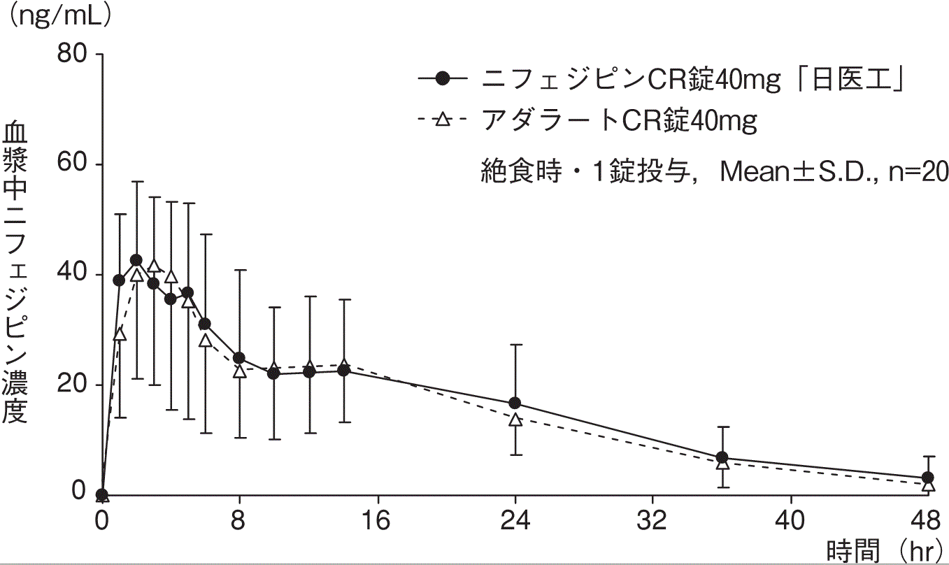 ニフェジピンCR錠40mg「日医工」及びアダラートCR錠40mgを、クロスオーバー法によりそれぞれ1錠(ニフェジピンとして40mg)健康成人男子に絶食及び食後単回経口投与して血漿中ニフェジピン濃度を測定し、得られた薬物動態パラメータ(AUC、Cmax)について90%信頼区間法にて統計解析を行った結果、log(0.80)~log(1.25)の範囲内であり、両剤の生物学的同等性が確認された5)。