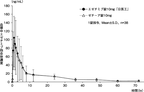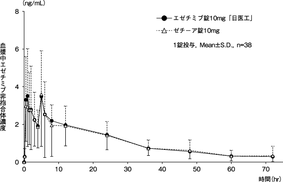 エゼチミブ錠10mg「日医工」及びゼチーア錠10mgを、クロスオーバー法によりそれぞれ1錠(エゼチミブとして10mg)健康成人男性に絶食単回経口投与して血漿中エゼチミブ非抱合体濃度及び血漿中エゼチミブ抱合体濃度を測定し、得られた薬物動態パラメータ(AUC、Cmax)について90%信頼区間法にて統計解析を行った結果、log(0.80)~log(1.25)の範囲内であり、両剤の生物学的同等性が確認された8)。
