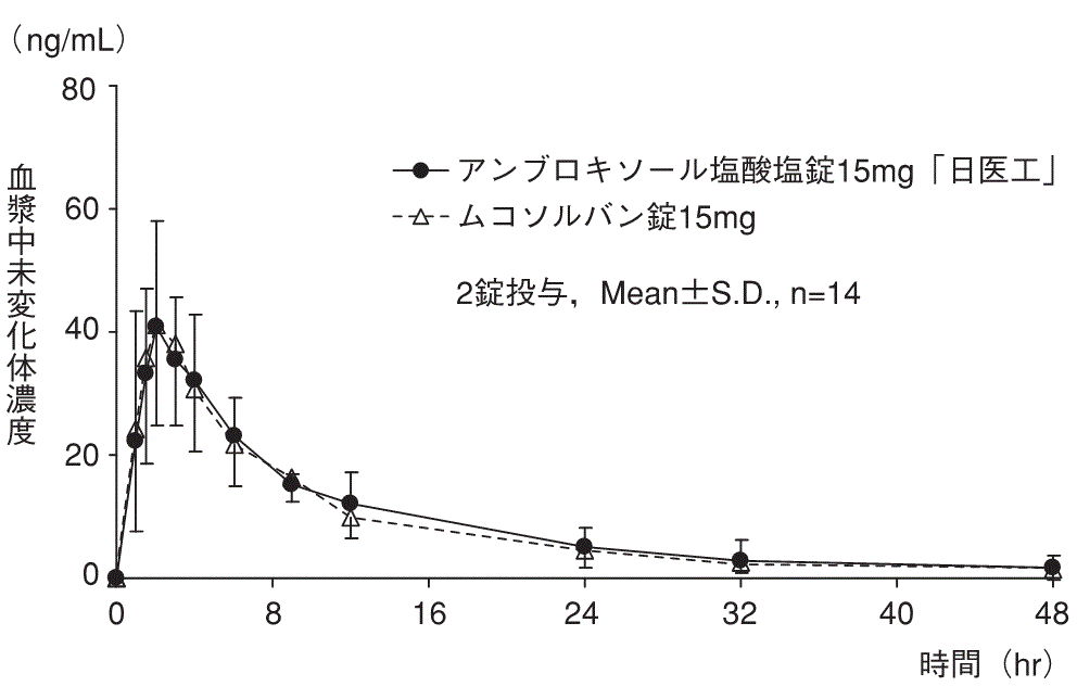 アンブロキソール塩酸塩錠15mg「日医工」及びムコソルバン錠15mgを、クロスオーバー法によりそれぞれ2錠(アンブロキソール塩酸塩として30mg)健康成人男子に絶食単回経口投与して血漿中未変化体濃度を測定し、得られた薬物動態パラメータ(AUC、Cmax)について統計解析を行った結果、両剤の生物学的同等性が確認された1)。