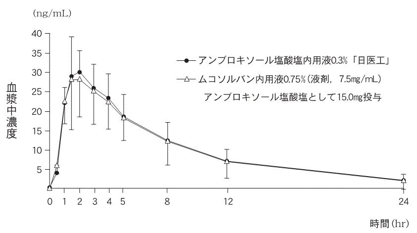 アンブロキソール塩酸塩内用液0.3%「日医工」5mL(アンブロキソール塩酸塩として15.0mg)とムコソルバン内用液0.75%2mL(アンブロキソール塩酸塩として15.0mg)を、クロスオーバー法によりそれぞれ健康成人男子に絶食単回経口投与して血漿中アンブロキソール濃度を測定し、得られた薬物動態パラメータ(AUC、Cmax)について分散分析法にて統計解析を行った結果、両剤の生物学的同等性が確認された1)。
