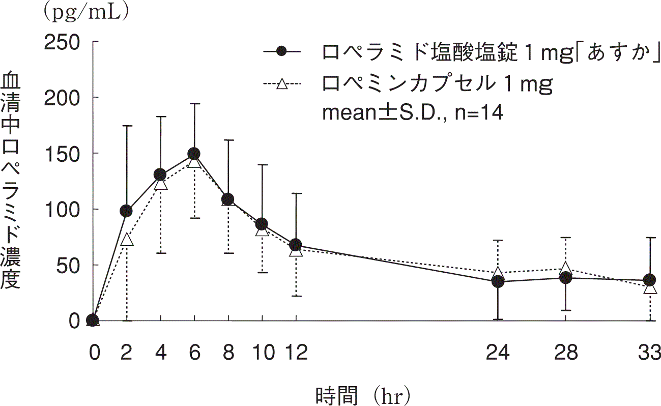 健康成人男性にロペラミド塩酸塩錠1mg「あすか」6錠(ロペラミド塩酸塩として6mg)注)とロペミンカプセル1mg 6カプセル(ロペラミド塩酸塩として6mg)注)をクロスオーバー法によりそれぞれ絶食単回経口投与して血清中ロペラミド濃度を測定し、得られた薬物動態パラメータ(AUC、Cmax)について統計解析を行った結果、両剤の生物学的同等性が確認された5)。