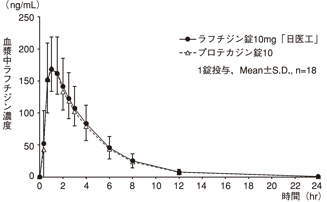 ラフチジン錠10mg「日医工」及びプロテカジン錠10を、クロスオーバー法によりそれぞれ1錠(ラフチジンとして10mg)健康成人男子に絶食単回経口投与して血漿中ラフチジン濃度を測定し、得られた薬物動態パラメータ(AUC、Cmax)について90%信頼区間法にて統計解析を行った結果、log(0.80)~log(1.25)の範囲内であり、両剤の生物学的同等性が確認された2)。