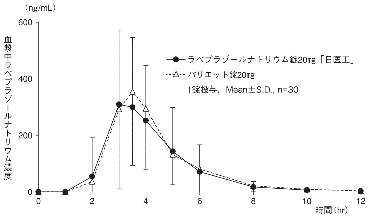 ラベプラゾールナトリウム錠20mg「日医工」及びパリエット錠20mgを、クロスオーバー法によりそれぞれ1錠(ラベプラゾールナトリウムとして20mg)健康成人男子に絶食単回経口投与して血漿中ラベプラゾールナトリウム濃度を測定し、得られた薬物動態パラメータ(AUC、Cmax)について90%信頼区間法にて統計解析を行った結果、log(0.80)~log(1.25)の範囲内であり、両剤の生物学的同等性が確認された3)。