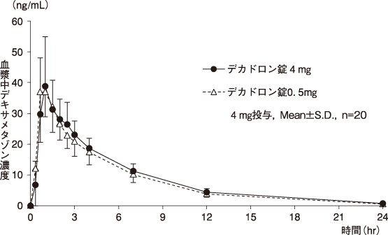 デカドロン錠4mg 1錠及びデカドロン錠0.5mg 8錠(デキサメタゾンとして4mg)をクロスオーバー法により健康成人男性に絶食単回経口投与して血漿中デキサメタゾン濃度を測定し、得られた薬物動態パラメータ(AUC、Cmax)について90%信頼区間法にて統計解析を行った結果、log(0.80)~log(1.25)の範囲内であり、両剤の生物学的同等性が確認された3)。