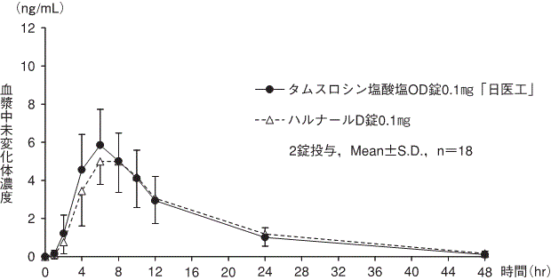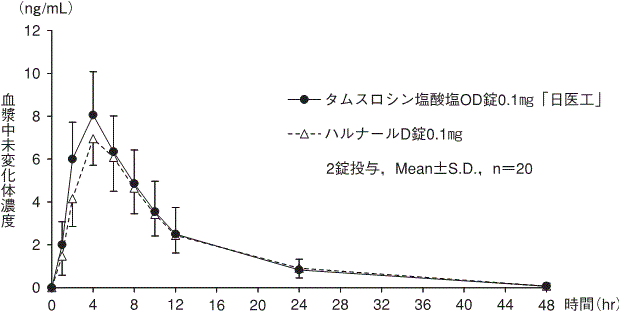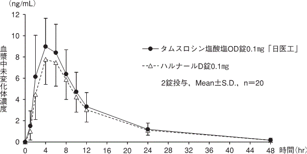 タムスロシン塩酸塩OD錠0.1mg「日医工」及びハルナールD錠0.1mgを、クロスオーバー法によりそれぞれ2錠(タムスロシン塩酸塩として0.2mg)健康成人男子に単回経口投与(絶食時-水あり、絶食時-水なし、食後-水なし)して血漿中未変化体濃度を測定し、得られた薬物動態パラメータ(AUC、Cmax)について90%信頼区間法にて統計解析を行った結果、log(0.80)~log(1.25)の範囲内であり、両剤の生物学的同等性が確認された6)。