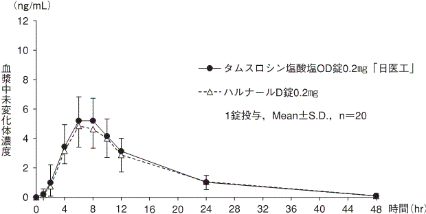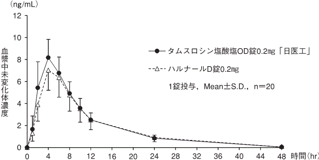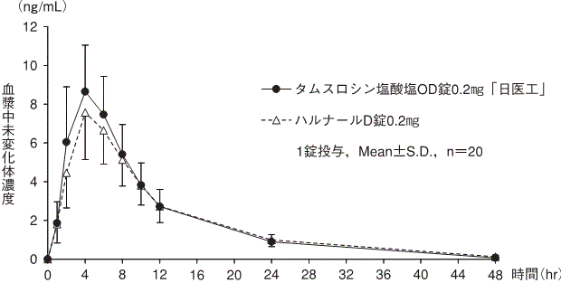 タムスロシン塩酸塩OD錠0.2mg「日医工」及びハルナールD錠0.2mgを、クロスオーバー法によりそれぞれ1錠(タムスロシン塩酸塩として0.2mg)健康成人男子に単回経口投与(絶食時-水あり、絶食時-水なし、食後-水なし)して血漿中未変化体濃度を測定し、得られた薬物動態パラメータ(AUC、Cmax)について90%信頼区間法にて統計解析を行った結果、log(0.80~log(1.25)の範囲内であり、両剤の生物学的同等性が確認された7)。