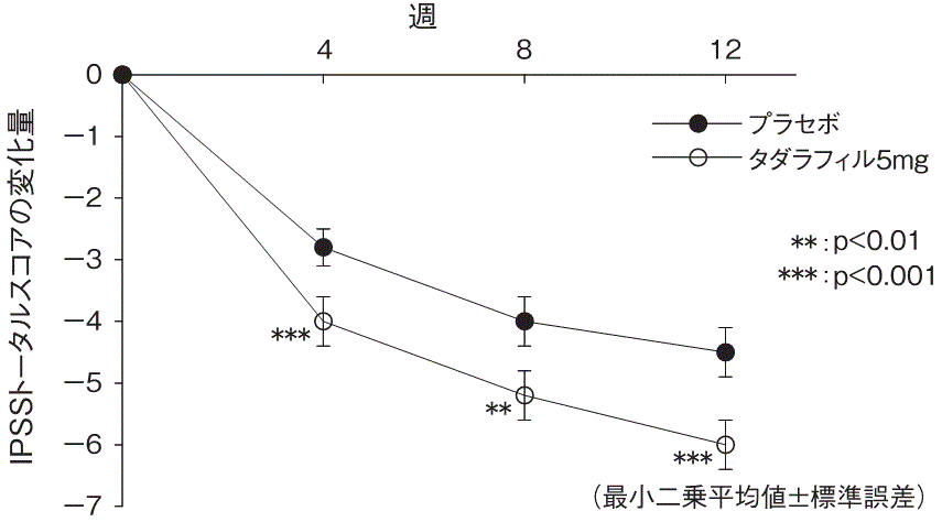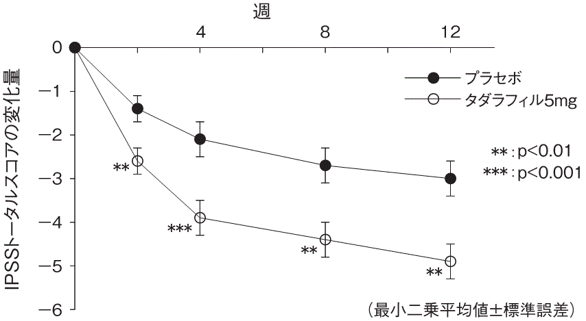 第Ⅱ相試験を完了した394例の被験者が42週の長期投与非盲検試験に参加した。前立腺肥大症に伴う排尿障害患者にタダラフィル5mgを1日1回54週間(二重盲検期間12週を含む)長期継続投与した結果、IPSSトータルスコアの継続的な改善の維持が認められ、長期の安全性及び良好な忍容性が確認された44),49)。副作用発現頻度は、タダラフィル5mg群で10.7%(42/394例)であった。主な副作用は、消化不良及び胃食道逆流性疾患が各1.3%(5/394例)であった。
