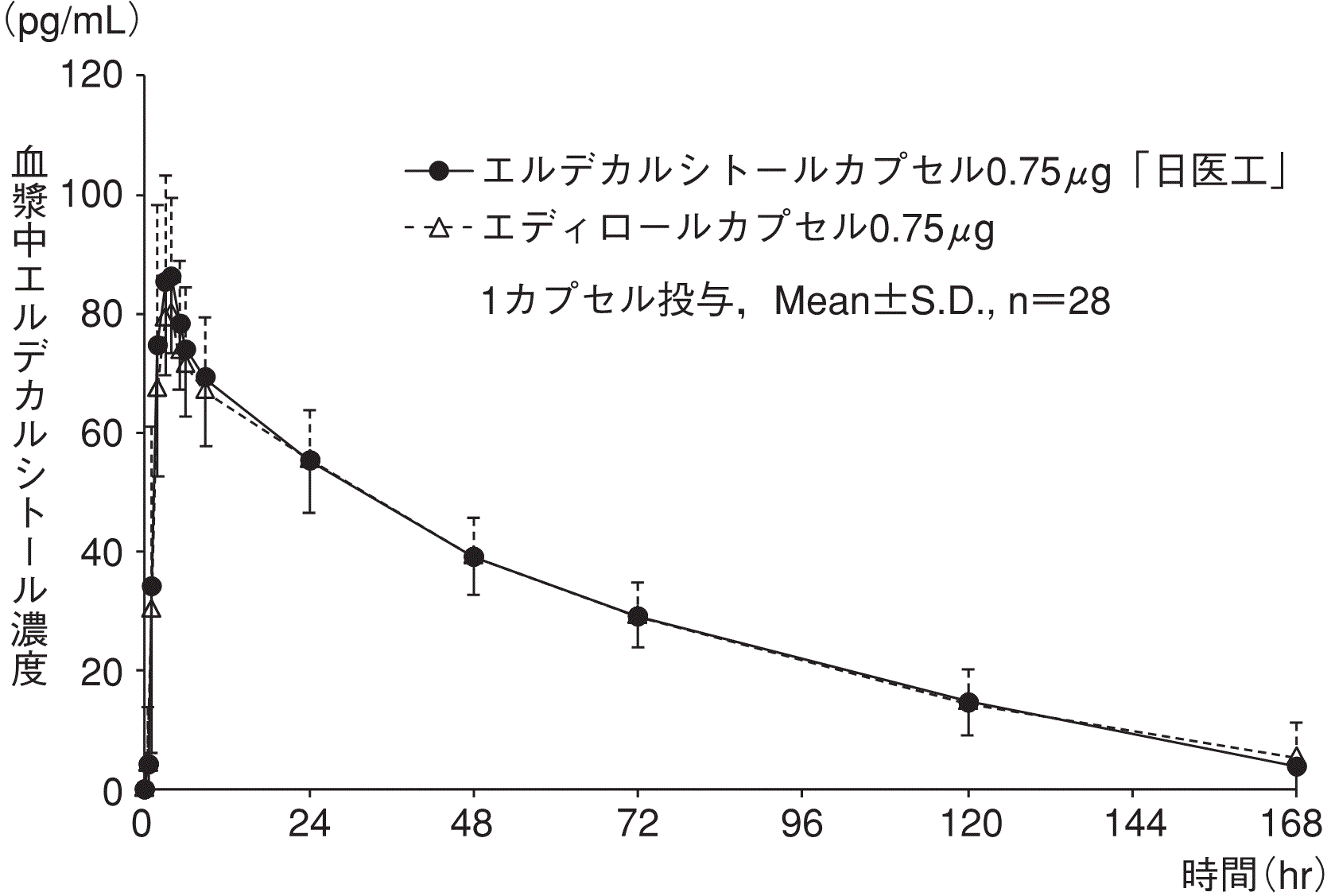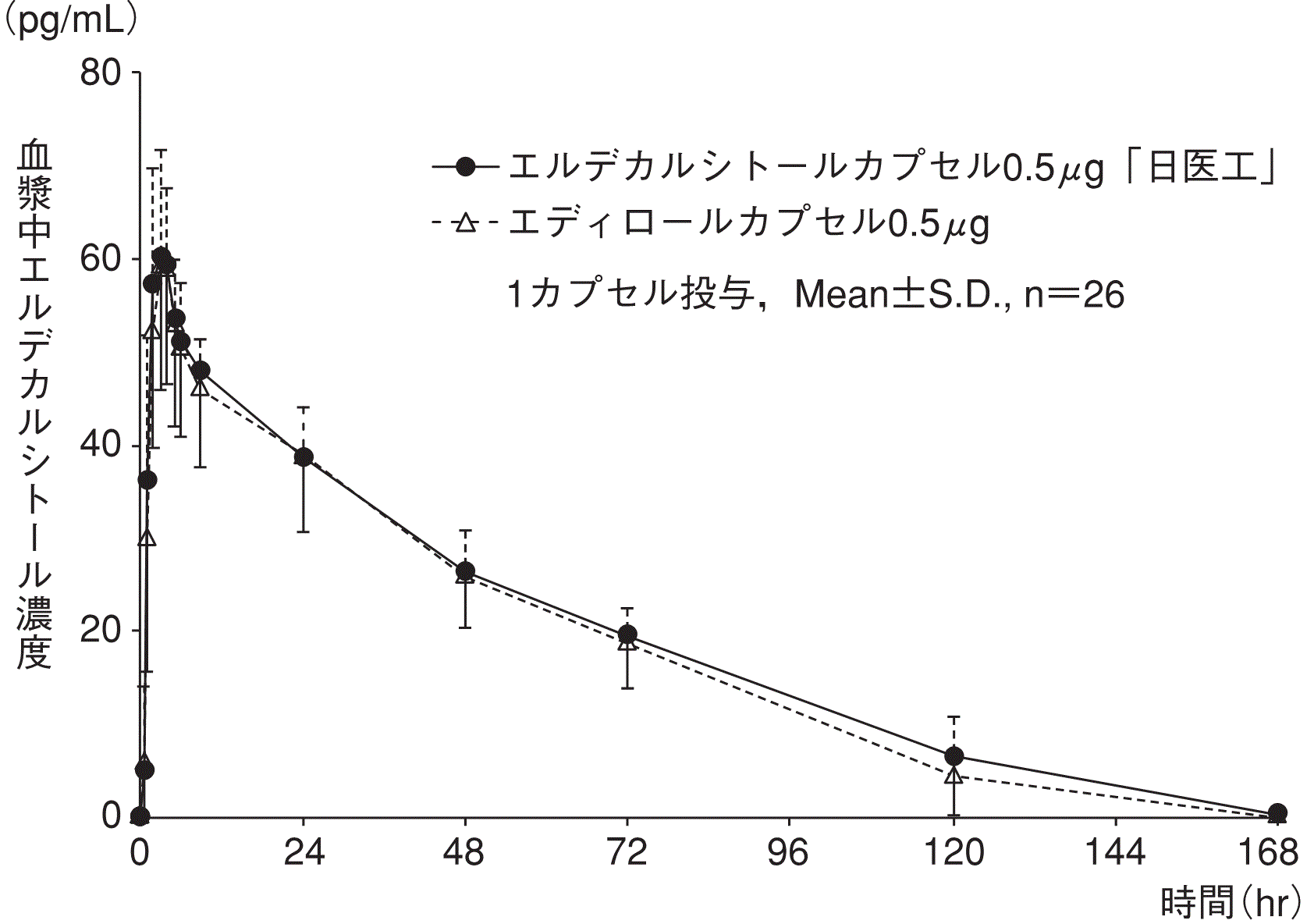エルデカルシトールカプセル0.5μg「日医工」及びエディロールカプセル0.5μgを、クロスオーバー法によりそれぞれ1カプセル(エルデカルシトールとして0.5μg)健康成人男性に絶食単回経口投与して血漿中エルデカルシトール濃度を測定し、得られた薬物動態パラメータ(AUC、Cmax)について90%信頼区間法にて統計解析を行った結果、log(0.80)~log(1.25)の範囲内であり、両剤の生物学的同等性が確認された5)。