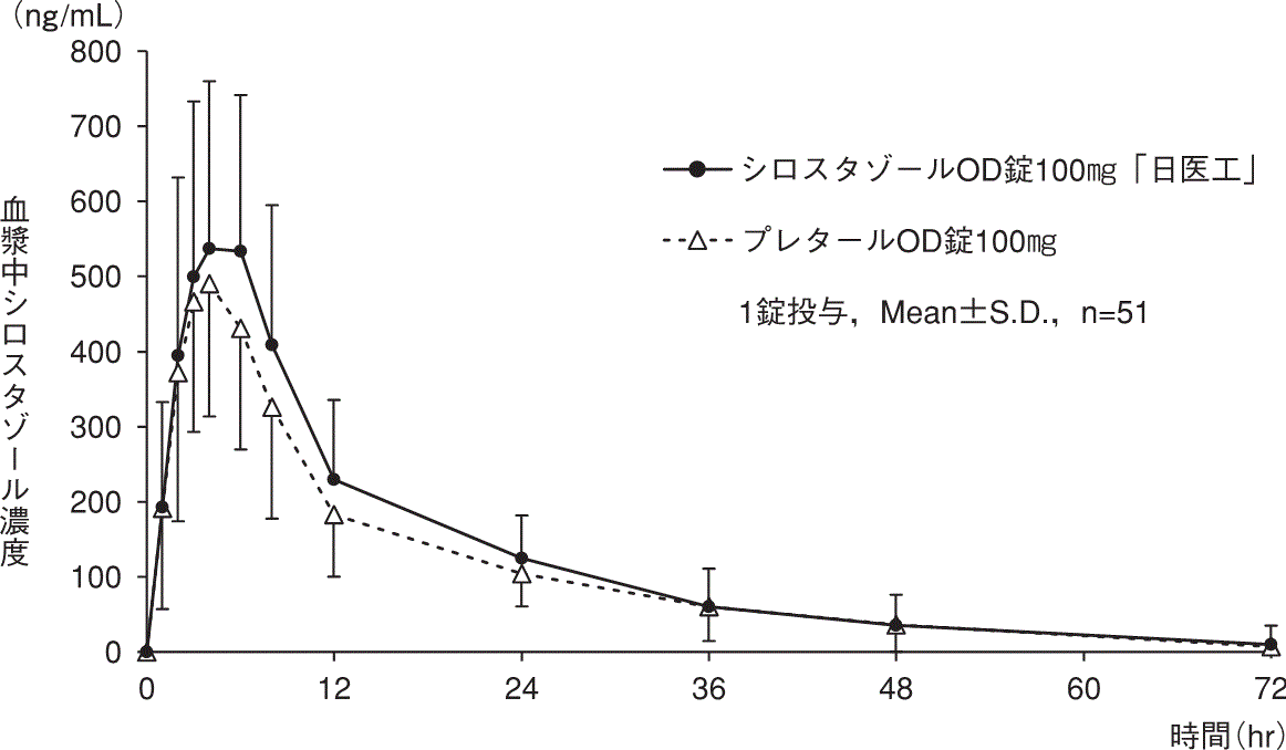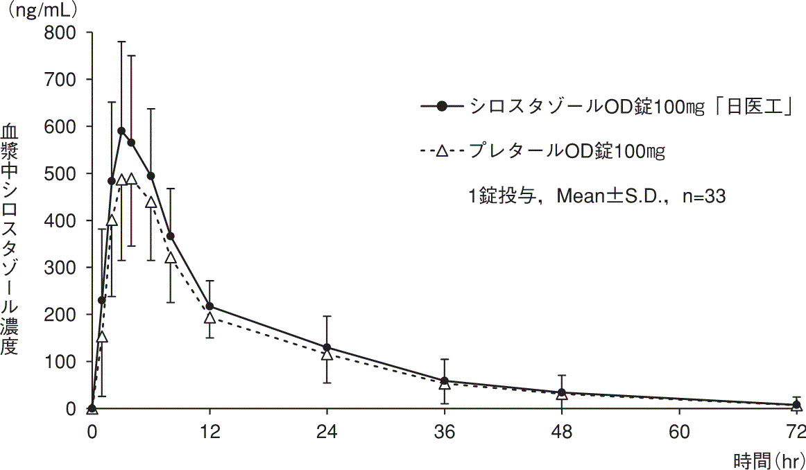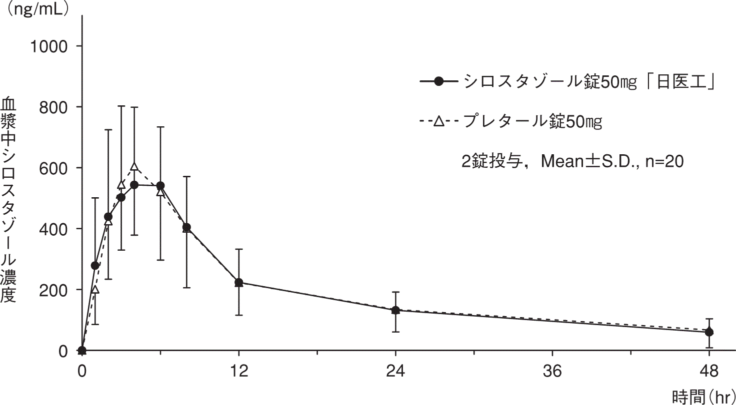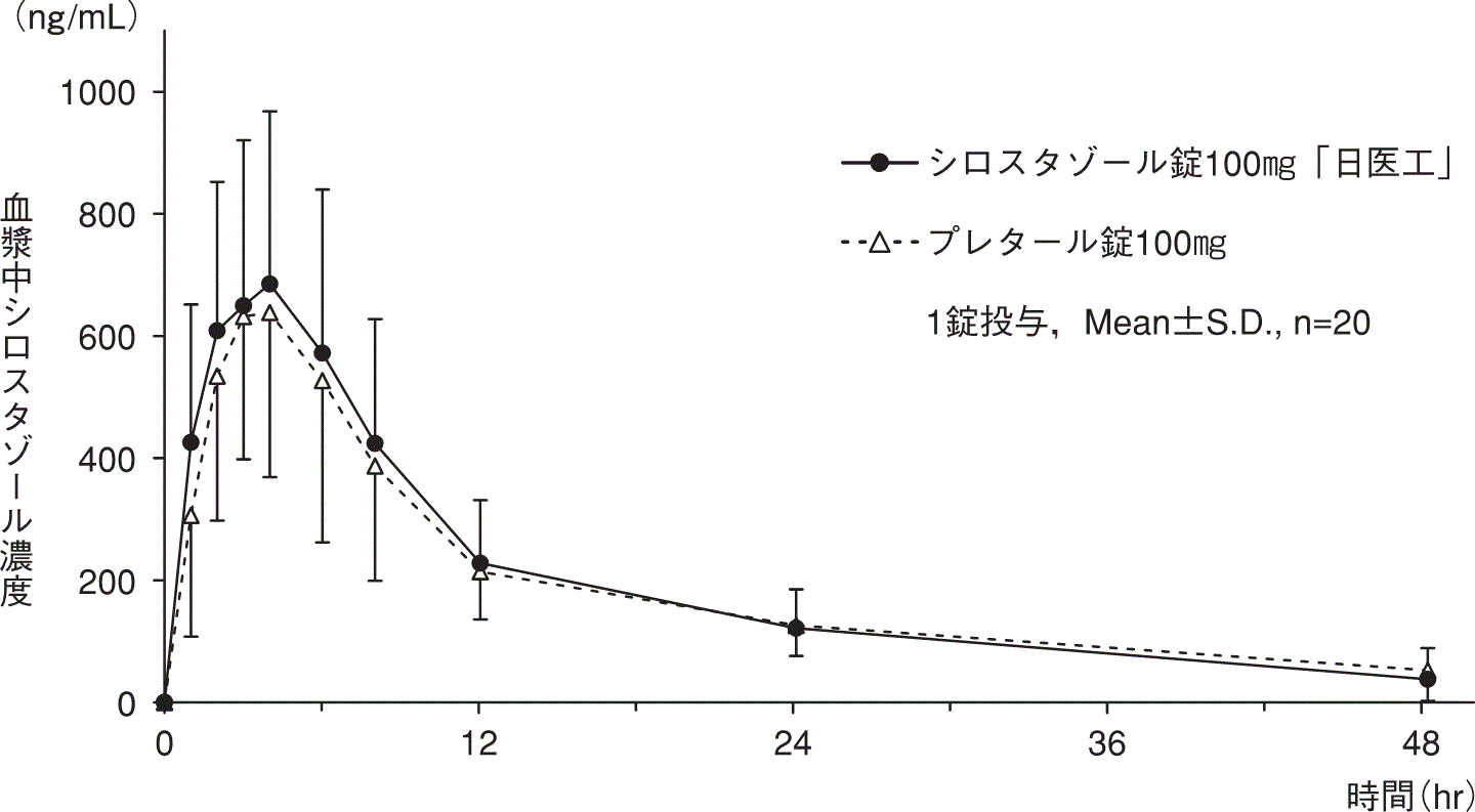 シロスタゾール錠50mg「日医工」及びプレタール錠50mgを、クロスオーバー法によりそれぞれ2錠(シロスタゾールとして100mg)健康成人男子に絶食単回経口投与して血漿中シロスタゾール濃度を測定し、得られた薬物動態パラメータ(AUC、Cmax)について90%信頼区間法にて統計解析を行った結果、log(0.8)~log(1.25)の範囲内であり、両剤の生物学的同等性が確認された10)。