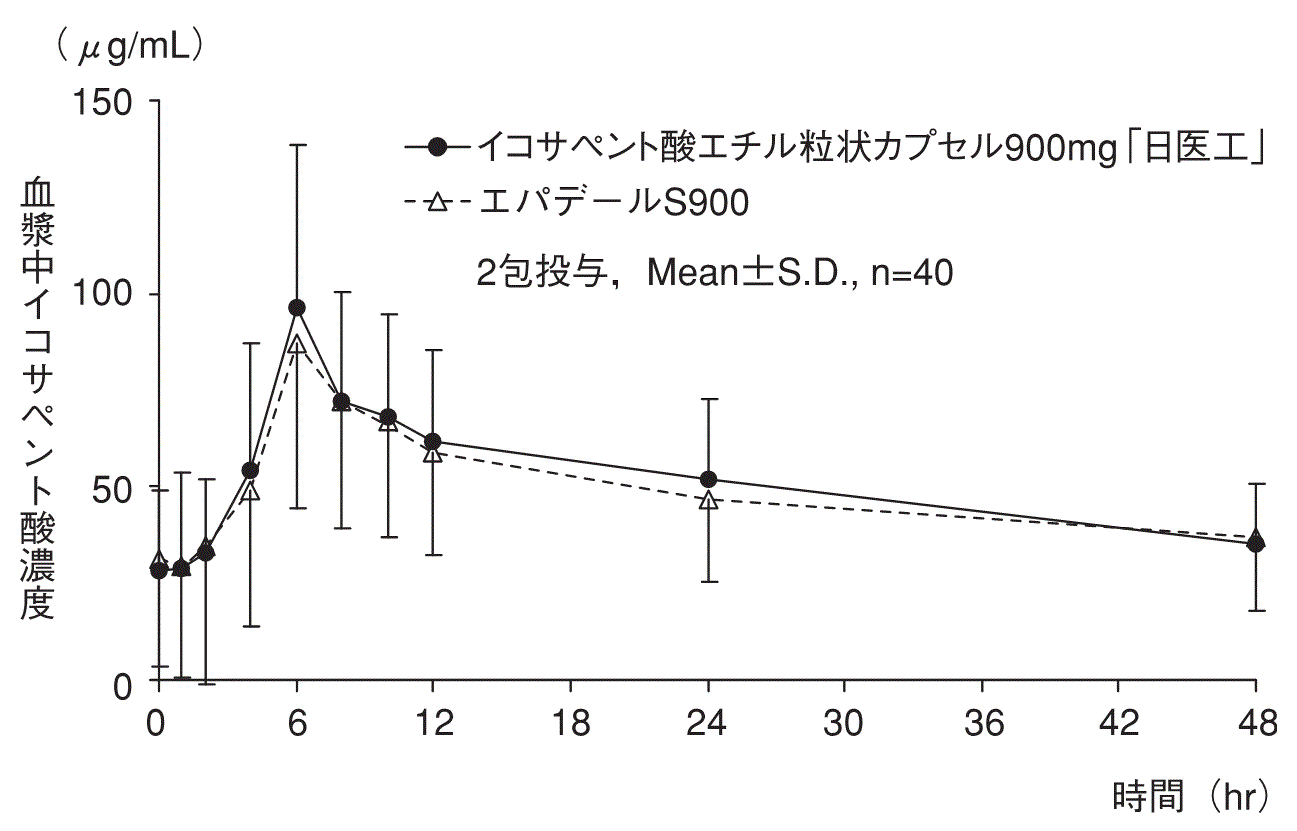 イコサペント酸エチル粒状カプセル900mg「日医工」及びエパデールS900を、クロスオーバー法によりそれぞれ2包(イコサペント酸エチルとして1800mg注3))健康成人男子に食後単回経口投与して血漿中イコサペント酸濃度を測定し、得られた薬物動態パラメータ(AUC、Cmax)について90%信頼区間法にて統計解析を行った結果、log(0.8)~log(1.25)の範囲内であり、両剤の生物学的同等性が確認された5)。