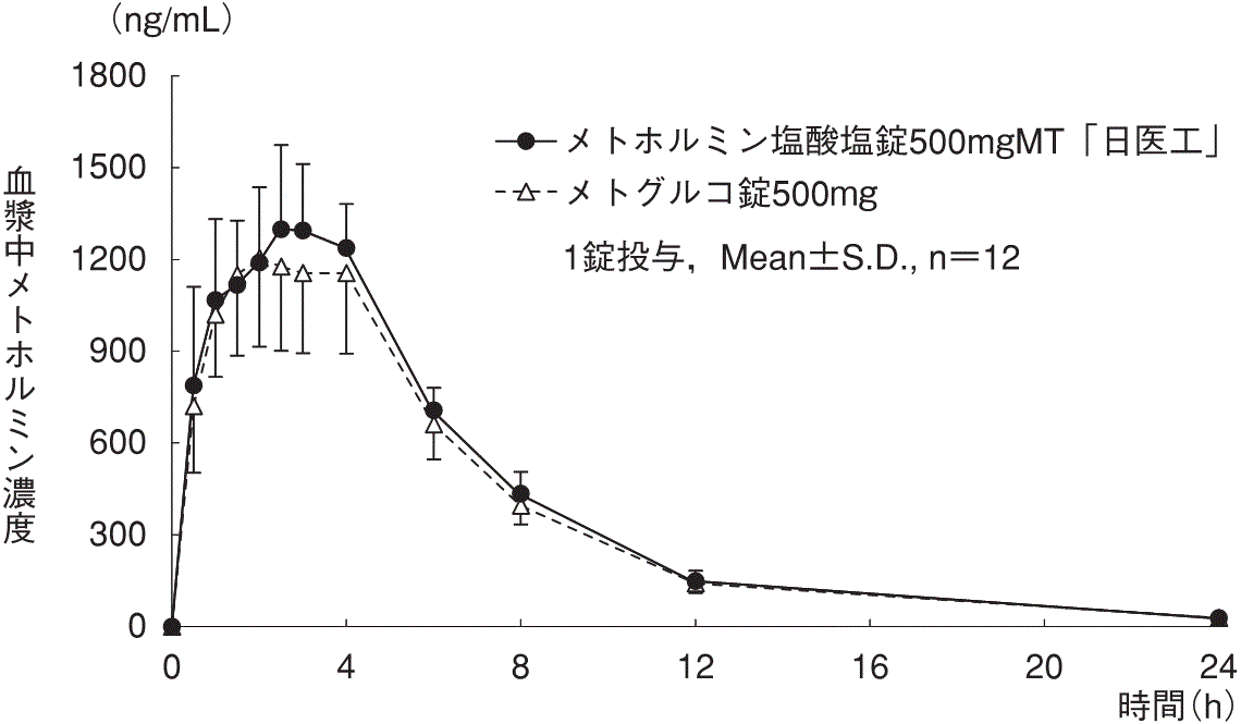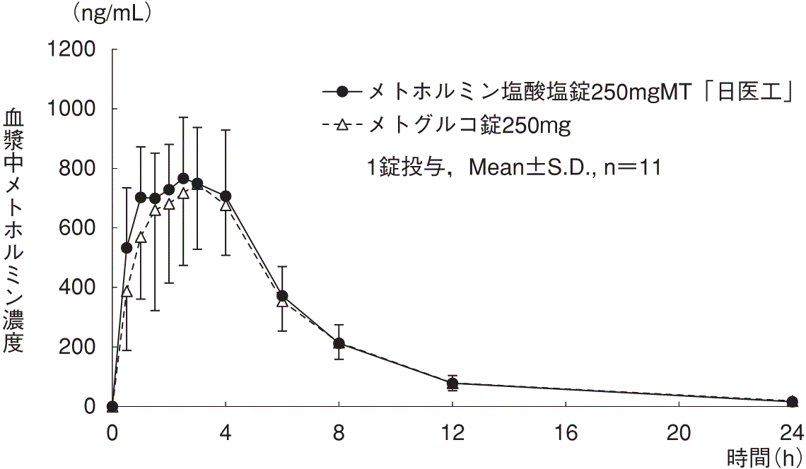 健康成人3例にメトホルミン塩酸塩500mgを単回経口投与したときの生物学的利用率は60.6%であった8)(外国人データ)。