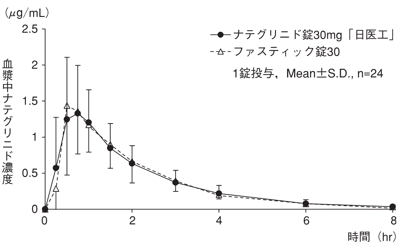 ナテグリニド錠30mg「日医工」及びファスティック錠30を、クロスオーバー法によりそれぞれ1錠(ナテグリニドとして30mg)健康成人男性に絶食単回経口投与して血漿中ナテグリニド濃度を測定し、得られた薬物動態パラメータ(AUC、Cmax)について90%信頼区間法にて統計解析を行った結果、log(0.80)~log(1.25)の範囲内であり、両剤の生物学的同等性が確認された2)。