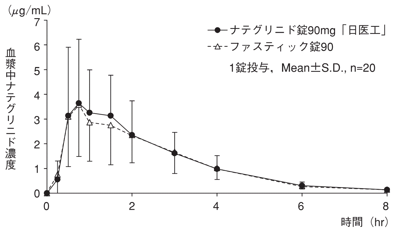 ナテグリニド錠90mg「日医工」及びファスティック錠90を、クロスオーバー法によりそれぞれ1錠(ナテグリニドとして90mg)健康成人男性に絶食単回経口投与して血漿中ナテグリニド濃度を測定し、得られた薬物動態パラメータ(AUC、Cmax)について90%信頼区間法にて統計解析を行った結果、log(0.80)~log(1.25)の範囲内であり、両剤の生物学的同等性が確認された2)。