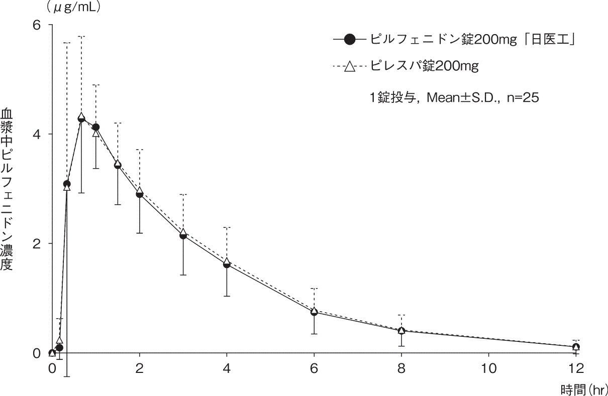 ピルフェニドン錠200mg「日医工」及びピレスパ錠200mgを、クロスオーバー法によりそれぞれ1錠(ピルフェニドンとして200mg)健康成人男性に絶食単回経口投与して血漿中ピルフェニドン濃度を測定し、得られた薬物動態パラメータ(AUC、Cmax)について90%信頼区間法にて統計解析を行った結果、log(0.80)~log(1.25)の範囲内であり、両剤の生物学的同等性が確認された12)。
