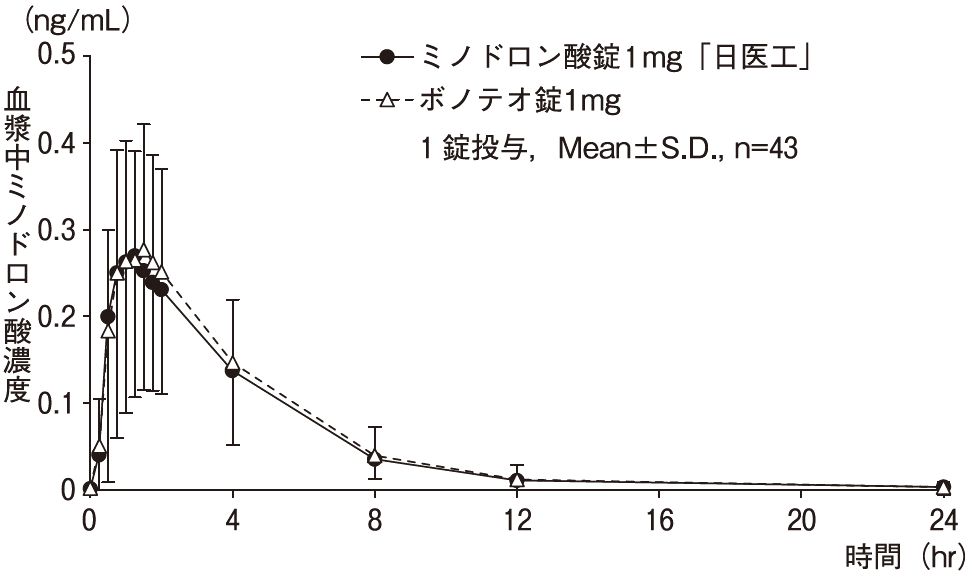 ミノドロン酸錠1mg「日医工」及びボノテオ錠1mgを、クロスオーバー法によりそれぞれ1錠(ミノドロン酸水和物として1mg)健康成人男子に絶食単回経口投与して血漿中ミノドロン酸濃度を測定し、得られた薬物動態パラメータ(AUC、Cmax)について統計解析を行った。その結果、AUCについては対数値の平均値の差の90%信頼区間がlog(0.80)~log(1.25)の範囲内であり、Cmaxについては対数値の平均値の差がlog(0.90)~log(1.11)で、かつ、溶出試験で規定するすべての条件で溶出挙動が類似していた。これより両剤の生物学的同等性が確認された4)。