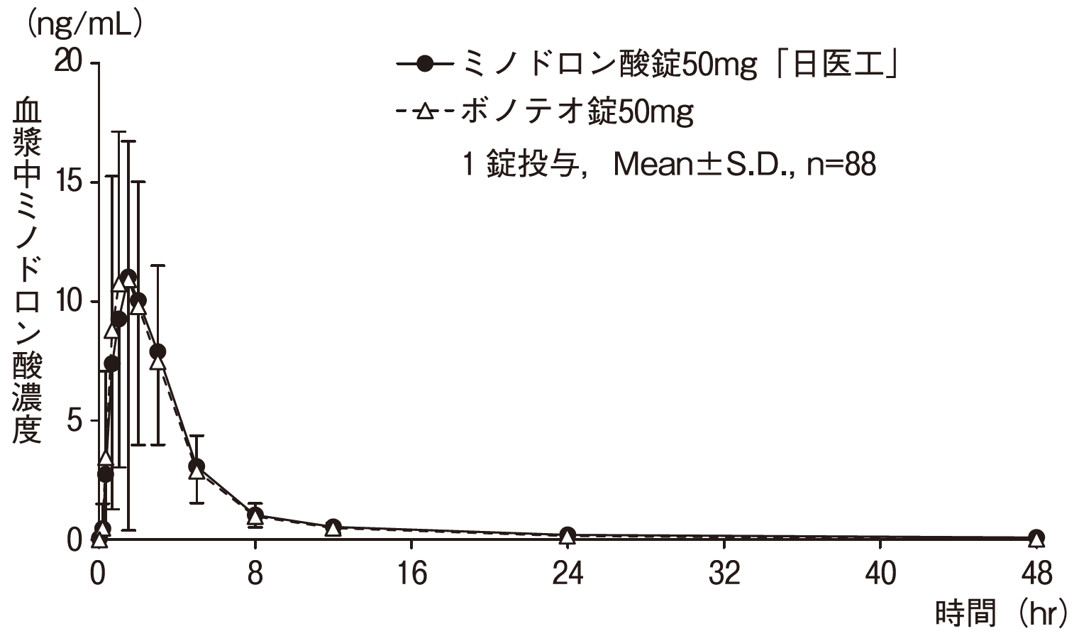 ミノドロン酸錠50mg「日医工」及びボノテオ錠50mgを、クロスオーバー法によりそれぞれ1錠(ミノドロン酸水和物として50mg)健康閉経後女性に絶食単回経口投与して血漿中ミノドロン酸濃度を測定し、得られた薬物動態パラメータ(AUC、Cmax)について90%信頼区間法にて統計解析を行った結果、log(0.80)~log(1.25)の範囲内であり、両剤の生物学的同等性が確認された4)。