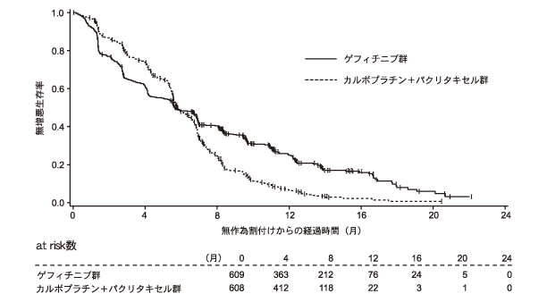 日本を含むアジアで実施した無作為化非盲検並行群間比較試験24)では、軽度の喫煙歴を有する又は非喫煙であり、かつ組織型が腺癌である、化学療法未治療の進行・再発非小細胞肺癌患者1217例(うち日本人233例)を対象に、ゲフィチニブ(250mg/日)と、カルボプラチンとパクリタキセルの併用化学療法が比較された。主要評価項目である無増悪生存期間及び副次評価項目である全生存期間の結果は下表及び下図の通りである。なお、本試験は無増悪生存期間における非劣性検証を主要目的として実施された。