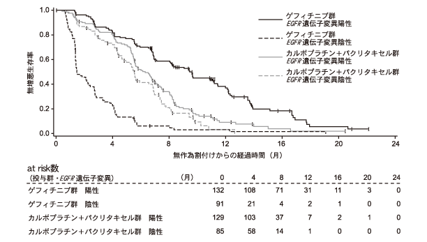 ゲフィチニブ投与群で安全性評価対象症例607例中538例(88.6%)に副作用が認められ、主な副作用は、発疹・ざ瘡394例(64.9%)、下痢254例(41.8%)、皮膚乾燥143例(23.6%)等であった。なお、急性肺障害・間質性肺炎は8例(1.3%)で、そのうち死亡例は3例であった。(効能・効果の一部変更承認時)また、EGFR遺伝子変異(Exon18~21の変異が検討された)の有無による部分集団解析の結果は、下表及び下図の通りである。