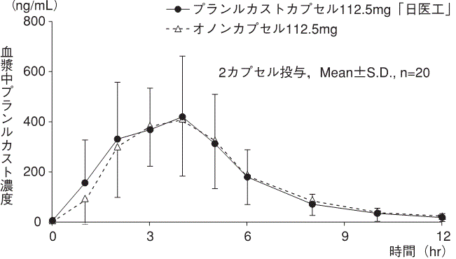 プランルカストカプセル112.5mg「日医工」及びオノンカプセル112.5mgを、クロスオーバー法によりそれぞれ2カプセル(プランルカスト水和物として225mg)健康成人男子に絶食単回経口投与して血漿中プランルカスト濃度を測定し、得られた薬物動態パラメータ(AUC、Cmax)について90%信頼区間法にて統計解析を行った結果、log(0.8)~log(1.25)の範囲内であり、両剤の生物学的同等性が確認された2)。