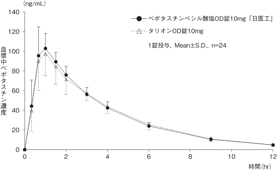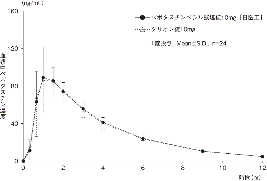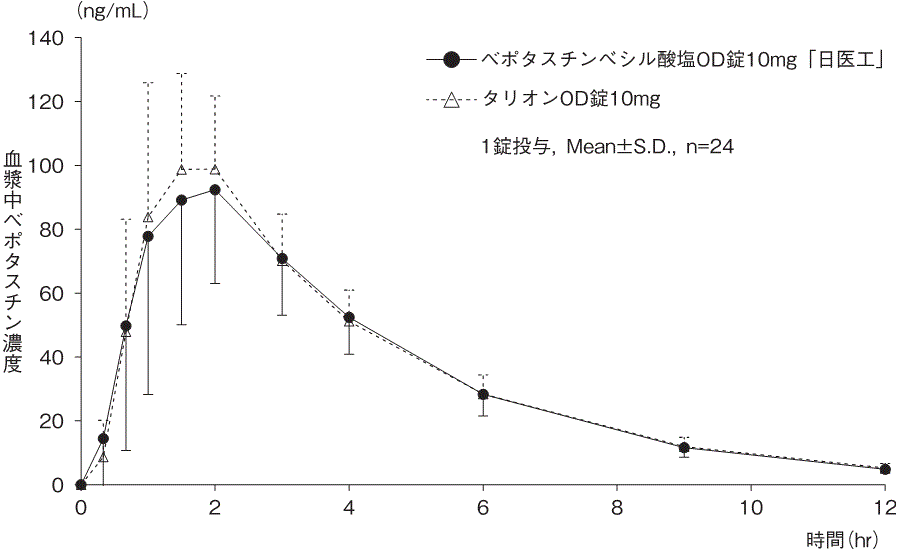 ベポタスチンベシル酸塩OD錠10mg「日医工」及びタリオンOD錠10mgを、クロスオーバー法によりそれぞれ1錠(ベポタスチンベシル酸塩として10mg)健康成人男性に絶食単回経口投与(水なしで服用及び水で服用)して血漿中ベポタスチン濃度を測定し、得られた薬物動態パラメータ(AUC、Cmax)について90%信頼区間法にて統計解析を行った結果、log(0.80)~log(1.25)の範囲内であり、両剤の生物学的同等性が確認された5)。