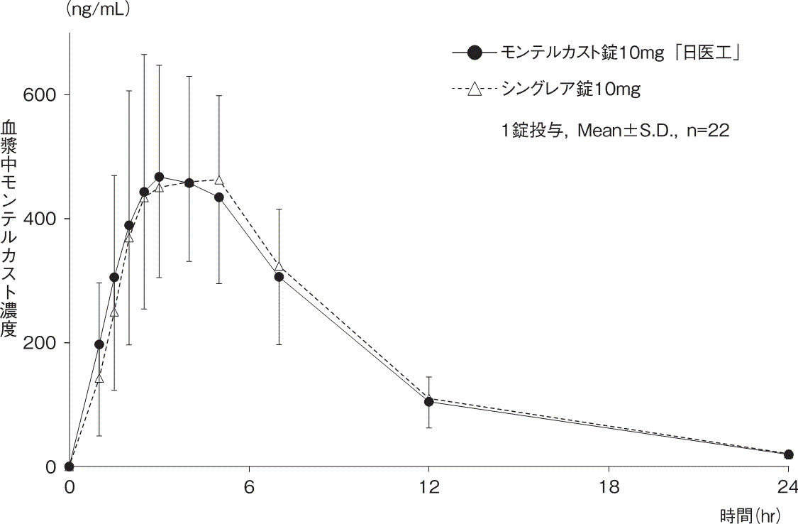 モンテルカスト錠10mg「日医工」及びシングレア錠10mgを、クロスオーバー法によりそれぞれ1錠(モンテルカストとして10mg)健康成人男性に絶食単回経口投与して血漿中モンテルカスト濃度を測定し、得られた薬物動態パラメータ(AUC、Cmax)について90%信頼区間法にて統計解析を行った結果、log(0.80)~log(1.25)の範囲内であり、両剤の生物学的同等性が確認された。5)。