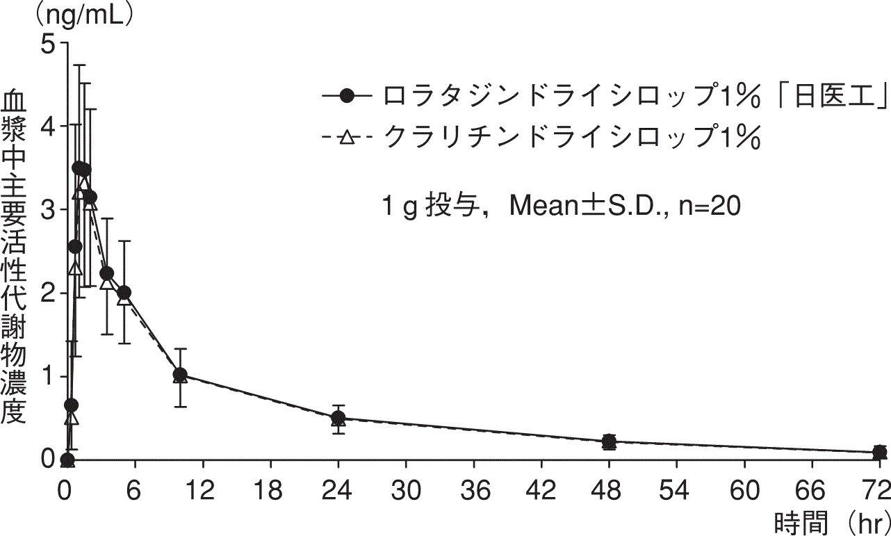 ロラタジンドライシロップ1%「日医工」及びクラリチンドライシロップ1%を、クロスオーバー法によりそれぞれ1g(ロラタジンとして10mg)健康成人男性に絶食単回経口投与して血漿中主要活性代謝物(DCL:descarboethoxyloratadine)濃度を測定し、得られた薬物動態パラメータ(AUC、Cmax)について90%信頼区間法にて統計解析を行った結果、log(0.80)~log(1.25)の範囲内であり、両剤の生物学的同等性が確認された3)。