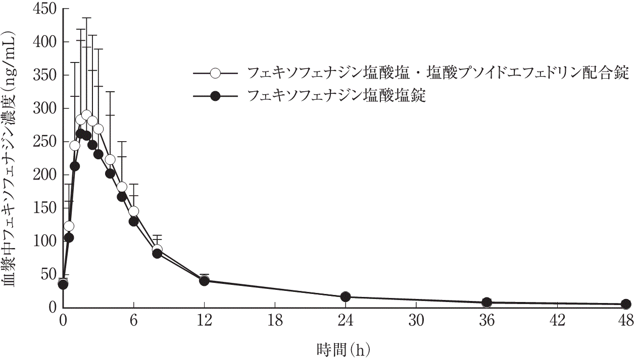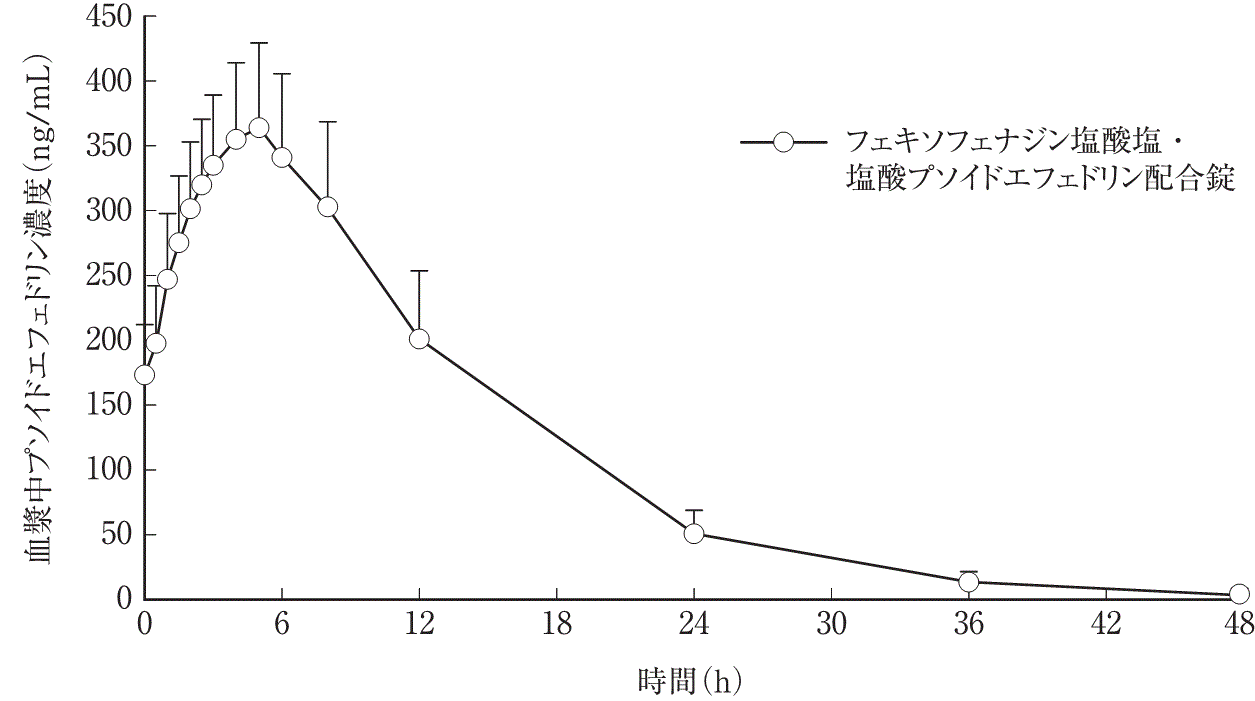 外国人健康成人男子22例に、クロスオーバー法でフェキソフェナジン塩酸塩60mg錠、塩酸プソイドエフェドリン120mg錠(徐放剤)及び両剤を併用して反復経口投与したとき、定常状態下における、単独投与時に対する併用投与時のフェキソフェナジン及びプソイドエフェドリンの血漿中Cmax及びAUC0-12はほぼ同様であった(外国人データ)。