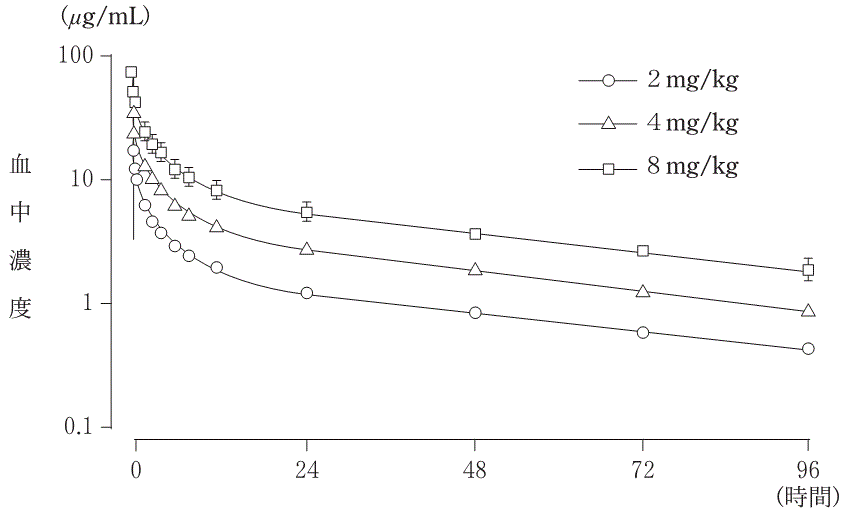 健康成人男子各群5例に2、4及び8mg/kgのテイコプラニンを30分かけて点滴静注したときの最高血漿中濃度はそれぞれ17.0、34.4及び71.8μg/mLを示し、投与後初期に比較的速やかに減少した後、終末半減期46~56時間ときわめて穏やかに消失した1)。