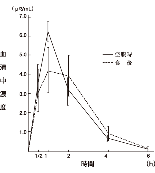 健康成人男子6名にバカンピシリン250mg(力価)を空腹時又は食後に経口投与した場合、血清中濃度は投与後1時間で最高に達し、その濃度は各々6.29μg/mL、4.22μg/mLであり、食事の影響をほとんど受けなかった4)。