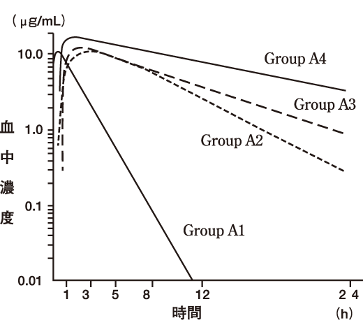 腎機能障害患者にバカンピシリン500mg(力価)を経口投与した場合、腎機能低下に応じて、排泄速度が遅延した。また、t1/2が延長し、AUCの上昇がみられた5)。