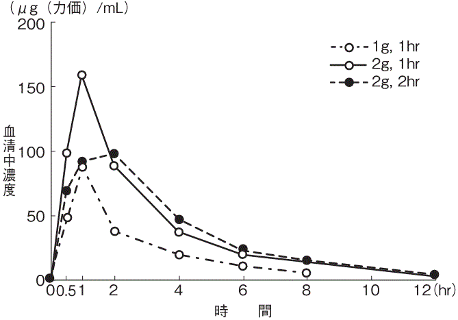 健康成人男性3例を対象に点滴静注したときの血清中濃度、薬物動態パラメータは、以下に示すとおりであった2)。