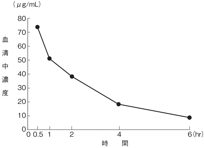 学童期の健康小児4例(体重20~37kg、平均28kg)にホスホマイシンナトリウム1.0g(力価)を4分間で静注したとき、30分~1時間後の血中濃度は93.8~107μg/mLであった4)。