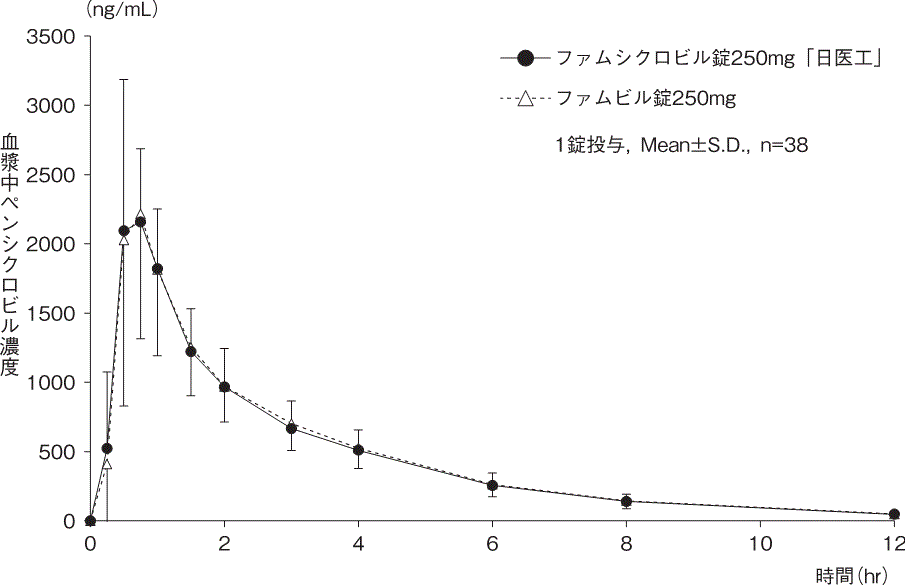 ファムシクロビル錠250mg「日医工」及びファムビル錠250mgを、クロスオーバー法によりそれぞれ1錠(ファムシクロビルとして250mg)健康成人男性に絶食単回経口投与して、活性代謝物であるペンシクロビルの血漿中濃度を測定し、得られた薬物動態パラメータ(AUC、Cmax)について90%信頼区間法にて統計解析を行った結果、log(0.80)~log(1.25)の範囲内であり、両剤の生物学的同等性が確認された12)。