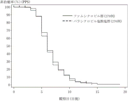 国内で実施されたアシクロビル対照二重盲検比較試験(計50施設、471例)において、病変部位が完全痂皮化するまでの日数で、ファムシクロビル(1回500mg1日3回投与)のアシクロビル(1回800mg1日5回投与)に対する非劣性が検証された(ハザード比1.080、信頼区間0.888~1.312)。また、ファムシクロビルとアシクロビルの完全痂皮化率の推移は概して相似しており、完全痂皮化までの日数の50%点はいずれも7日であった30)。